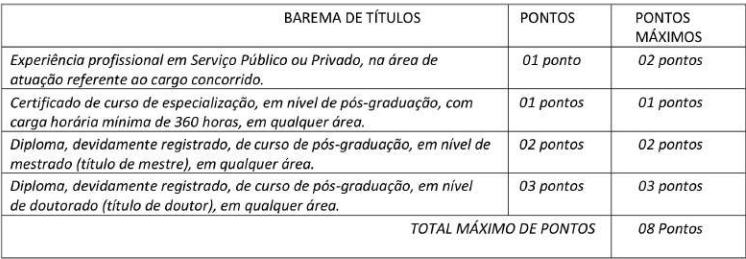 A avaliação de títulos valeu 8 pontos, ainda que a soma dos valores dos títulos apresentados fosse superior a esse valor. Era apenas para os cargos de nível superior, ou seja, Contador e Procurador Jurídico.