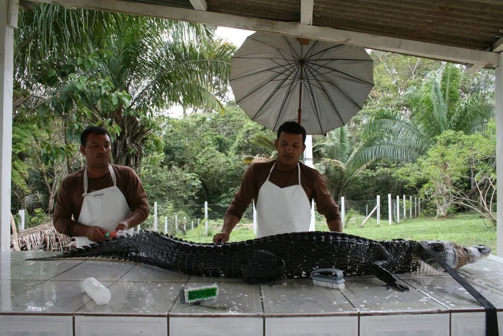 No Brasil, somente um frigorifico com liberação de manejo de jacarés está localizado dentro de uma Unidade de Conservação Federal. O local fica na Reserva Extrativista (Resex) Lago do Cuniã, situada no Baixo Madeira, em Porto Velho. Na reserva, mais de 36 mil jacarés vivem nos lagos da região. De acordo com o Instituto Chico Mendes de Conservação da Biodiversidade (ICMBio), todas as etapas, desde o manejo até a exportação da carne de jacaré são realizadas nas instalações dentro da reserva. Este é o único local legalmente autorizado a desenvolver essas atividades em uma unidade de conservação. O frigorífico foi desenvolvido dentro da reserva para manter o controle da espécies de forma sustentável e também incentivar o empreendedorismo coletivo dos moradores da comunidade, além de ajudar na segurança da comunidade, que convive com mais de 36 mil jacarés. Como surgiu o projeto? O projeto foi iniciado em 2004, após um acidente envolvendo um jacaré que resultou na morte de uma criança de seis anos que vivia na Resex. A partir disso, vários órgãos ambientais se uniram para desenvolver um projeto de aproveitamento do recursos naturais de forma sustentável e legalizada, de acordo com o ICMBio.